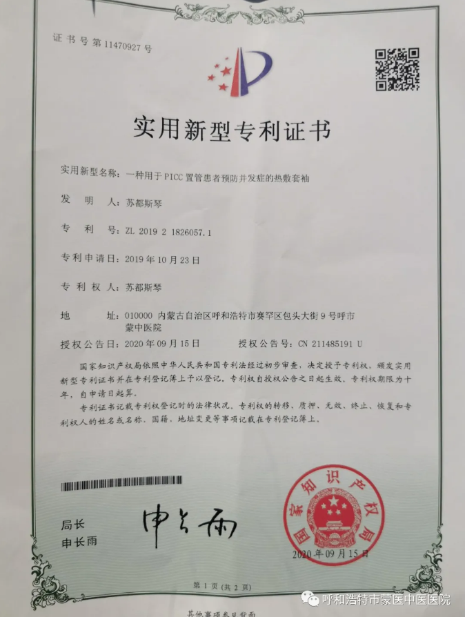 呼和浩特市“十三五”科技创新成果展于9月25日在呼和浩特科创中心开展,本次展览是第八届内蒙古“草原英才”高层次人才合作交流会暨呼包鄂乌人才创新创业周呼和浩特市主会场的一项重要活动。展览从科技创新引领工业发展新动能、科技助推现代农牧业发展、科技创新惠民生、科技创新载体建设、产学研合作、科技英才、科技特派员工作等方面充分展示了“十三五”以来呼和浩特市科技创新工作取得的显著成就。成果展以图片、模型、实物和多媒体为呈现手段,展示出了呼市“十三五”期间涌现出的科技人才和在新材料、新能源、生物医药、现代农牧业、医疗卫生健康等多个领域的150余项科技成果。其中av影片直播 蒙医心病科苏都斯琴的实用新型发明专利(一种用于PICC 置管患者预防并发症的热敷套袖)入选参展。该专利的展出为医院科技创新工作挣得了荣誉。