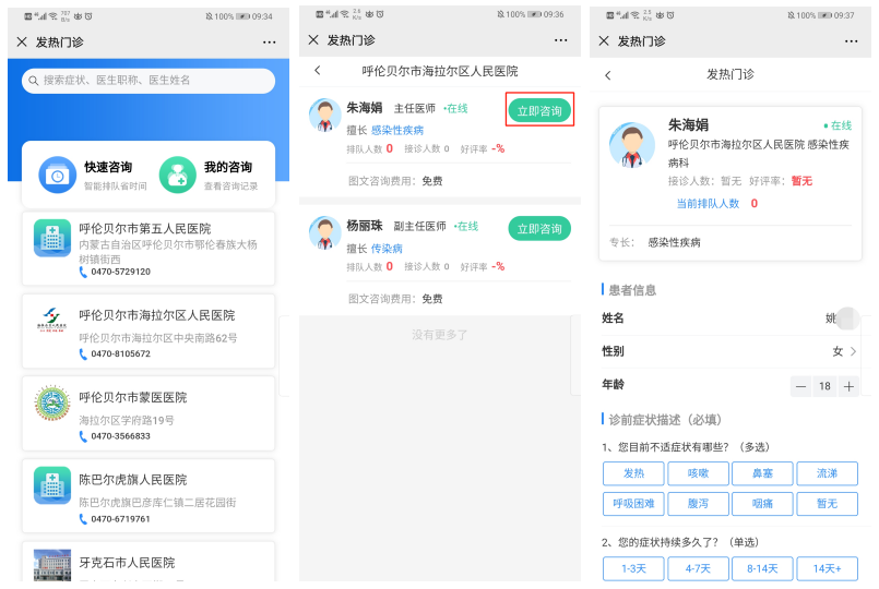 3.发热咨询:市民可点击“快速咨询”或选择自己想要咨询的医生,选择医院-选择值班医生,点击“立即咨询”,填写个人信息、描述症状后点击“确认咨询”。医生看到患者咨询后会尽快进行回复,患者也可以与医生进行图文、语音交流。