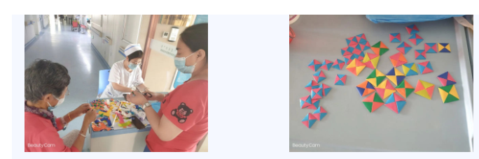 记得有一位腰椎间盘突出的患者, 她是从其它科室转入我们科室继续治疗的。入院后患者疼痛难忍,心情随之不太好,对待医护总是口气不是太好,因为疼痛患者拒绝翻身,拒绝护士碰她,她的心里也存在问题。 在杨主任的针灸治疗和推拿治疗下大有进步。她阿姨开始和我们进行沟通,可以慢慢的配合我们的工作,配合我们打针输液,治疗。在空闲的时候张护长也会带领我们和阿姨进行沟通,更进一步的了解对方,也会给阿姨进行心理疏导,阿姨慢慢的对我们也有了不一样的感觉,正逢每年一次的端午节,阿姨因为住院疫情期间住院管理工作更加严格,阿姨也不能与家里人团聚,于是张护长便亲手与患者一起折起了端午福。给阿姨和其它住院的患者带来了家的温馨。