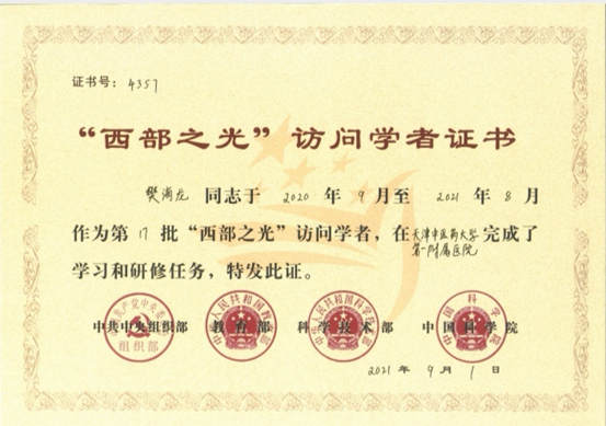 近日,中组部第十七批次“西部之光”访问学者、呼和浩特市蒙医中医医院樊海龙博士获颁“西部之光”访问学者证书。樊海龙博士表示:下一步将依托“石学敏国医大师传承工作室”,在院领导的支持下,落实好呼和浩特市人民政府“六大产业集群”建设项目之一“石学敏国医大师传承工作室建设项目”,把av影片直播