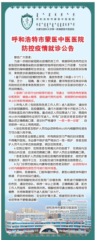 呼和浩特市蒙医中医医院防控疫情就诊公告